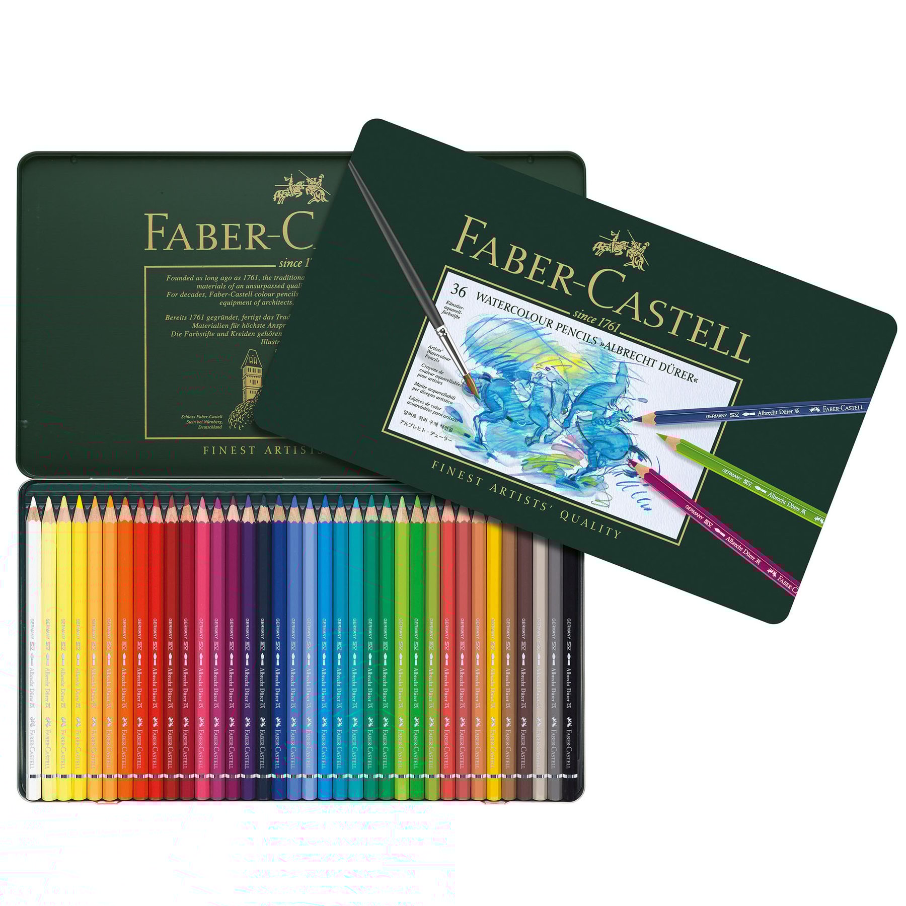 Акварелните моливи Albrecht Durer предоставят на творците многообразни способи на изразяване, чрез рисуване, оцветяване и акварелна живопис.Висококачествени материали в съчетание с над 250 годишен опит са вложени при създаването на тези акварелни моливи, които имат ненадминати акварелни ефекти и жизненост на цвета. Повърхността на листа може да бъде оцветена само с няколко фини или по-широки щрихи на четката, за да разкрият наситеността и уникалността на цветовете. В зависимост от използваната хартия пигментите на тези моливи могат да бъдат разтворени напълно и след това да се държат като класически акварелни бои.