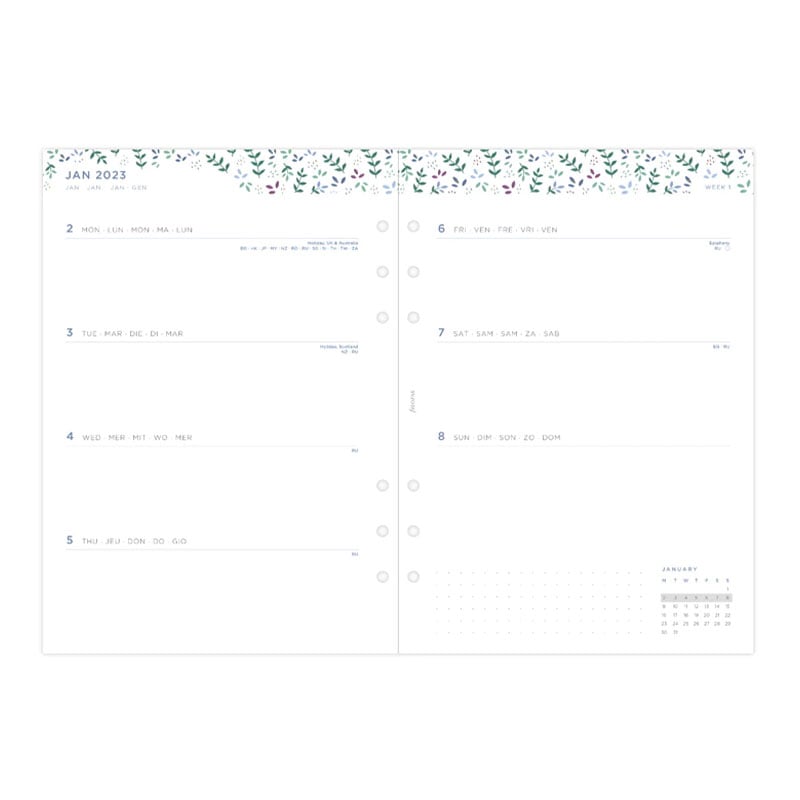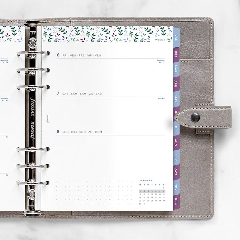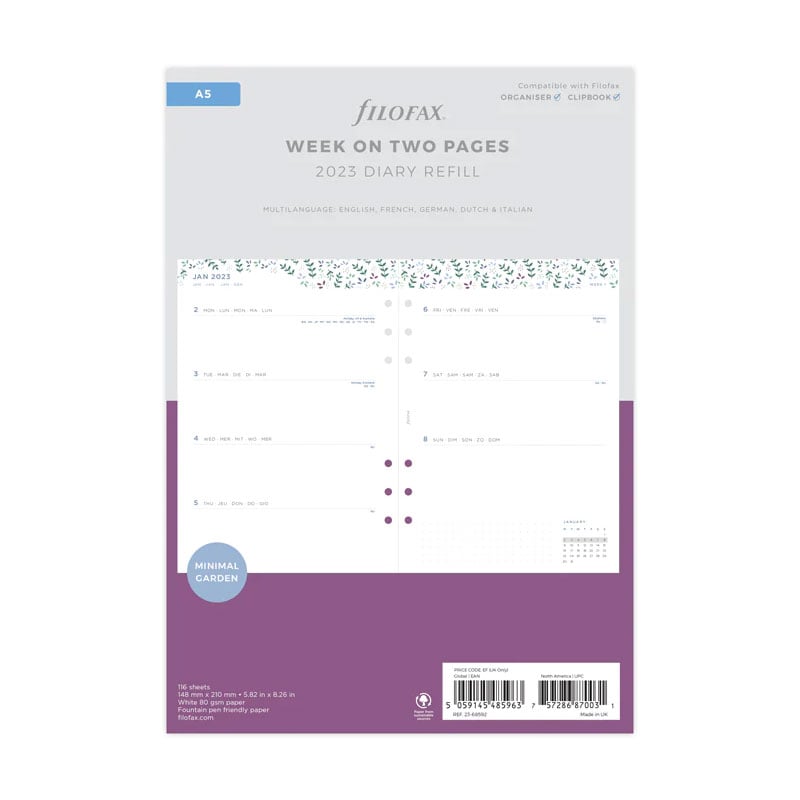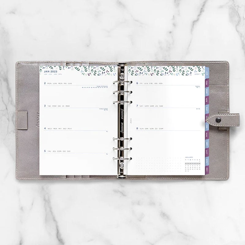 Планирайте седмичните си задачи и срещи с помощта на седмичния планер Filofax от колекцията Garden, съвместим с всички A5 органайзери и тефтери на марката.