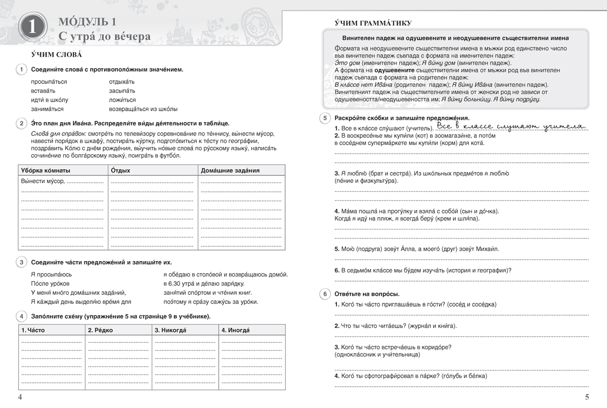 Учебната тетрадка е неразделна част от работата в час и вкъщи. Тя съдържа упражнения за затвърдяване на лексиката и граматиката, за четене и за писане. Всеки урок от тетрадката съдържа четири постоянни рубрики: УЧИМ СЛОВА, УЧИМ ГРАММАТИКУ, ЧИТАЕМ, ПИШЕМ.