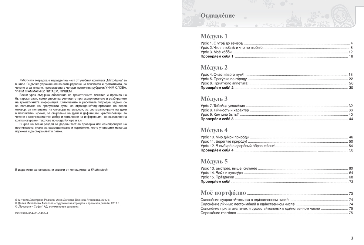 Учебната тетрадка към учебния комплекс „Матрьошка” за 6. клас е разработена съгласно държавния образователен стандарт и учебната програма, които влязоха в сила през 2016 г.