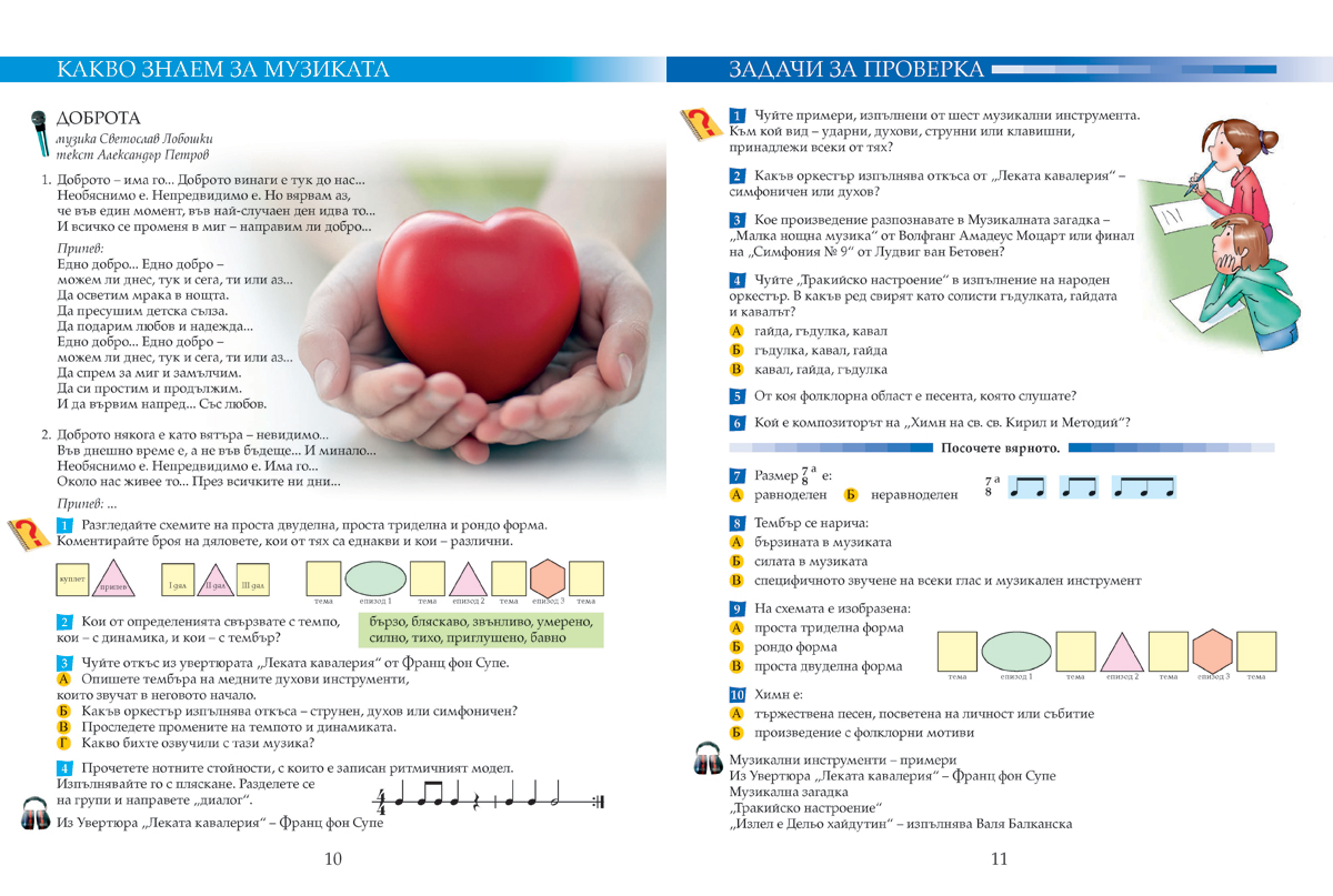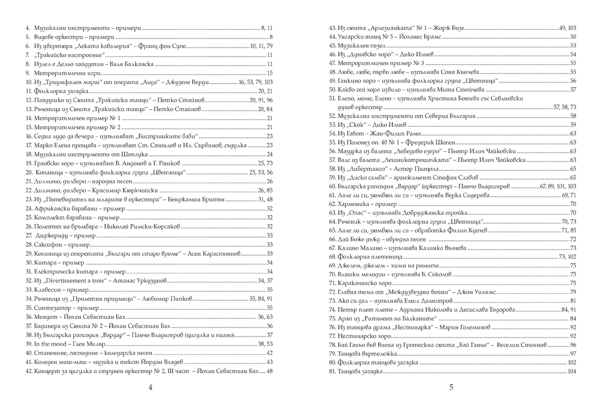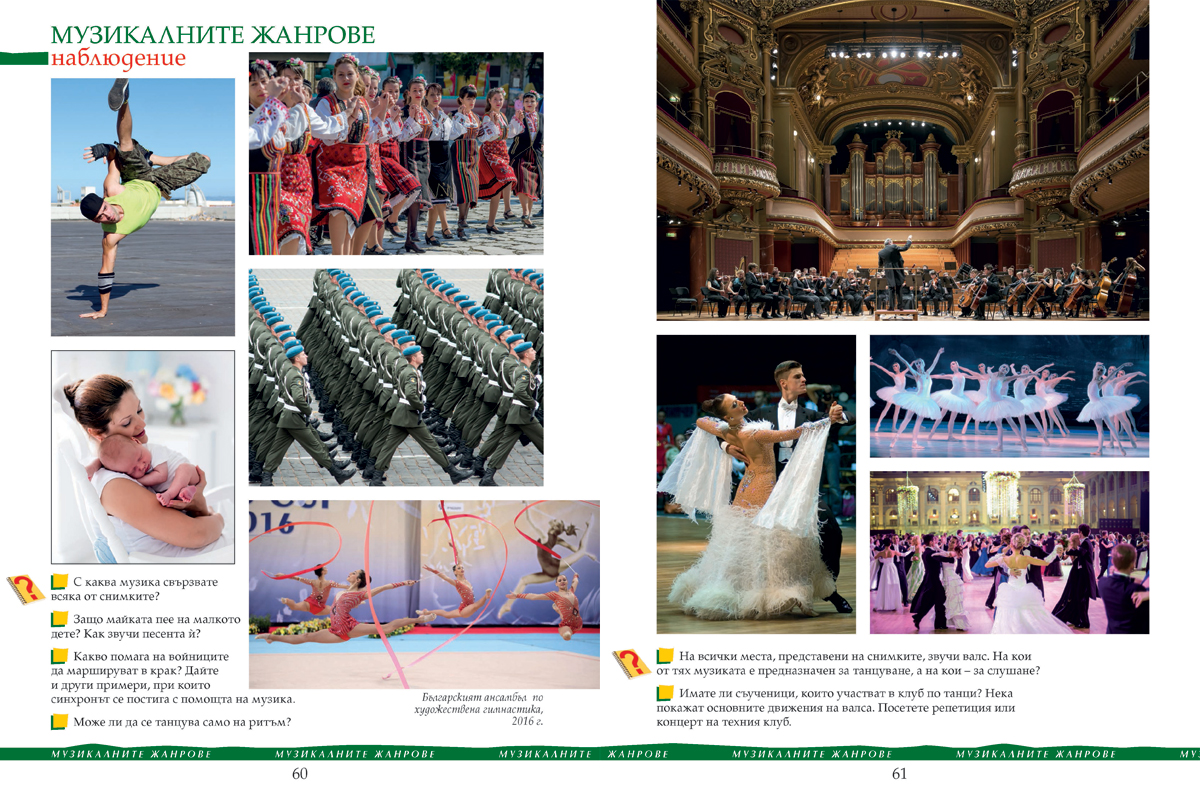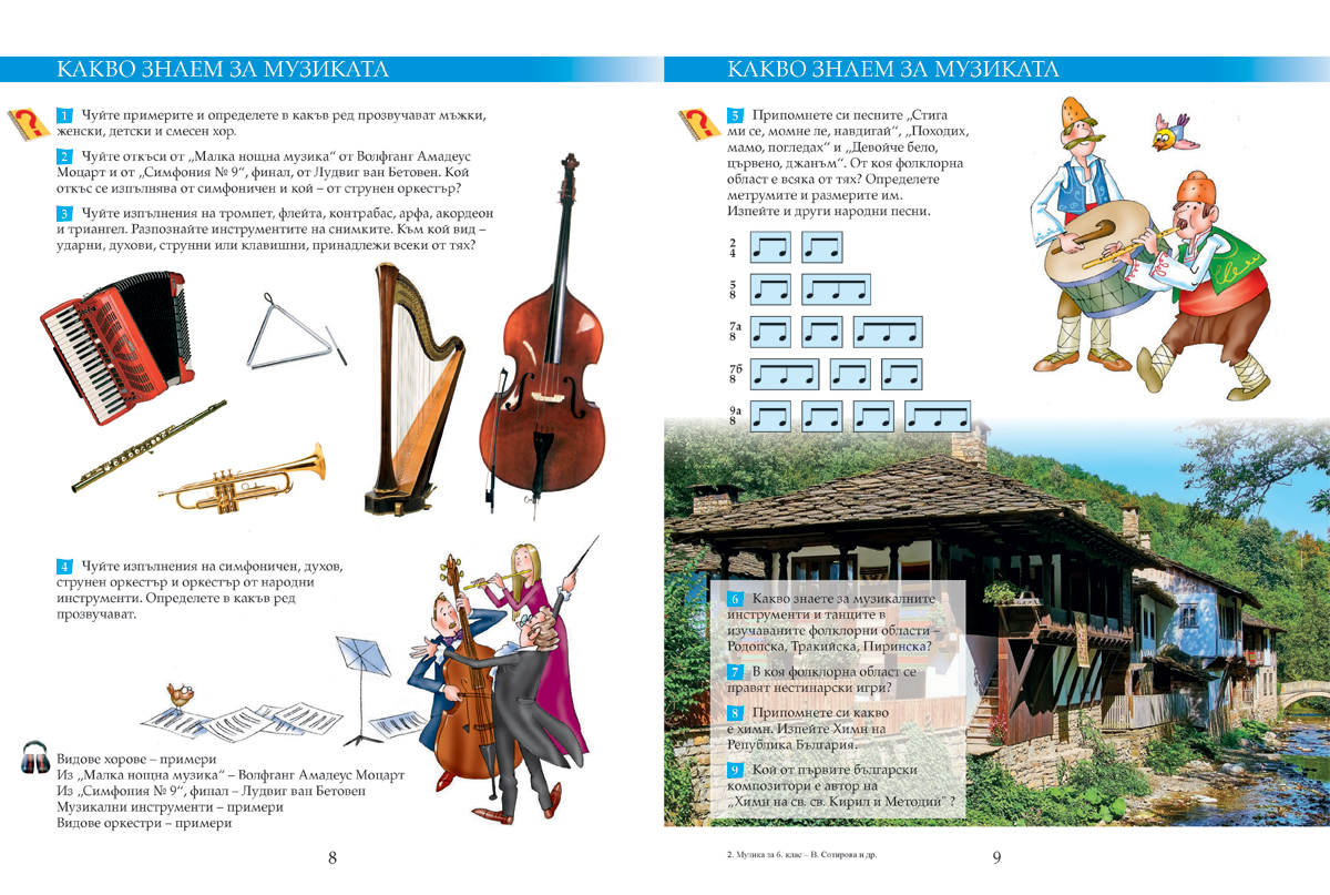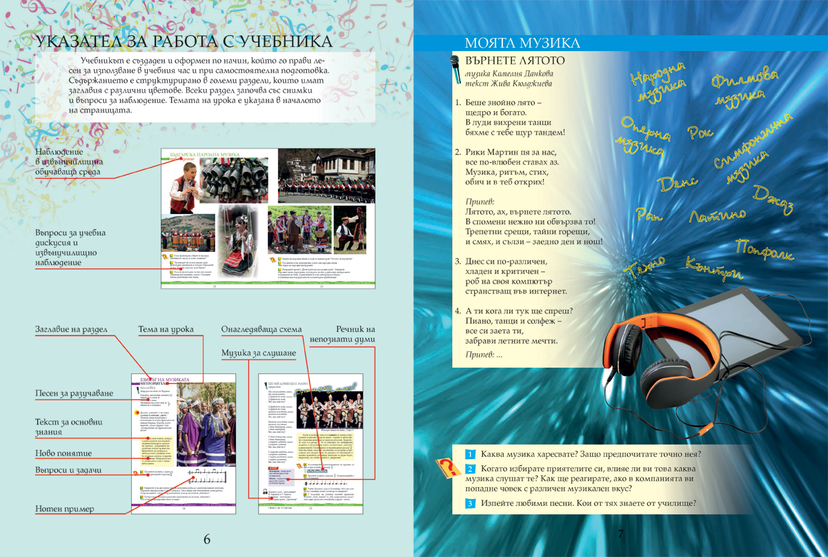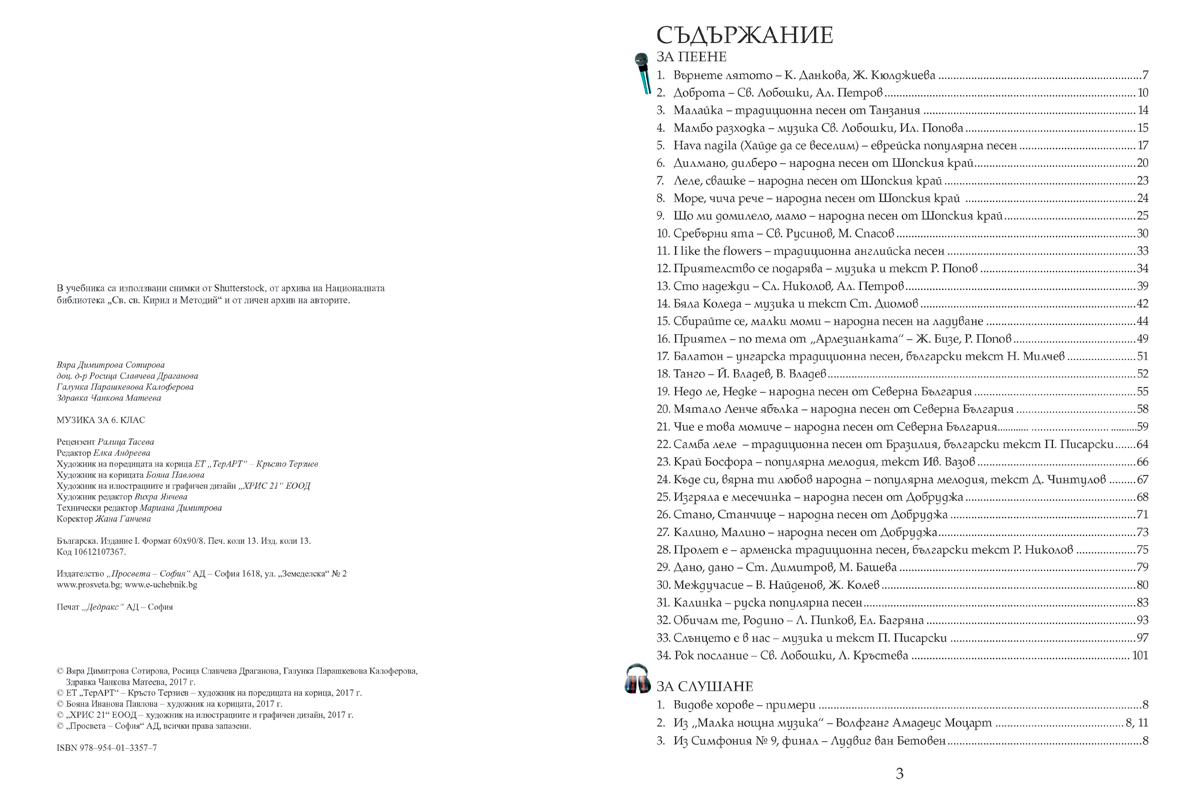Учебникът съдържа всички теми и нови понятия, осигурява изграждане на компетентностите, заложени като очакван резултат в учебната програма по музика за 6. клас, и гарантира постигането им.