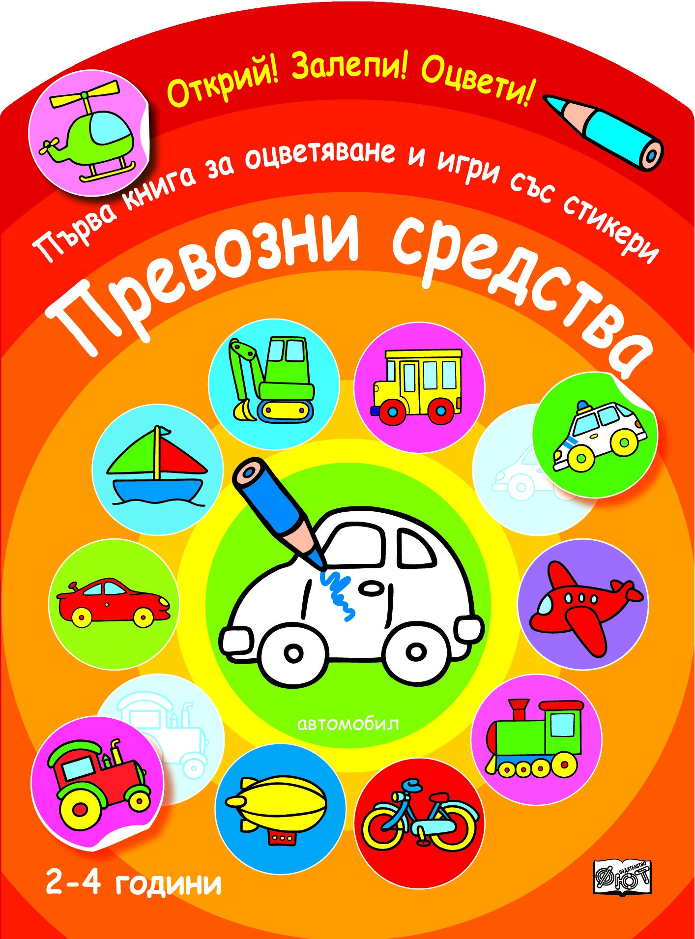 Открий! Залепи! Оцвети! Първа книга за оцветяване и игри със стикери: Превозни средства (2-4 години)