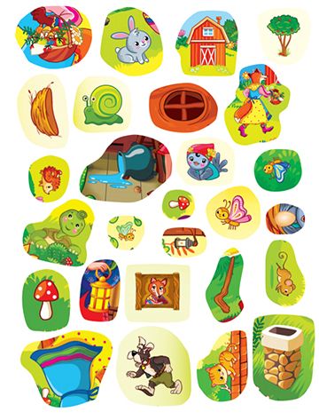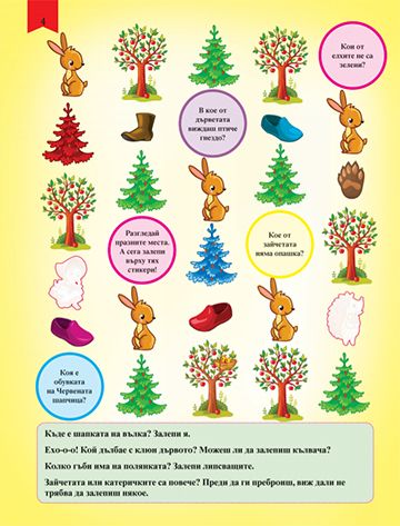 Скъпи деца, тази книжка с цветни стикери ще ви поведе на едно увлекателно пътешествие в страната на приказките. Прочетете интересните истории и разгледайте внимателно всяка от картинките. Намерете верните отговори на въпросите и залепете стикерите на правилното място.